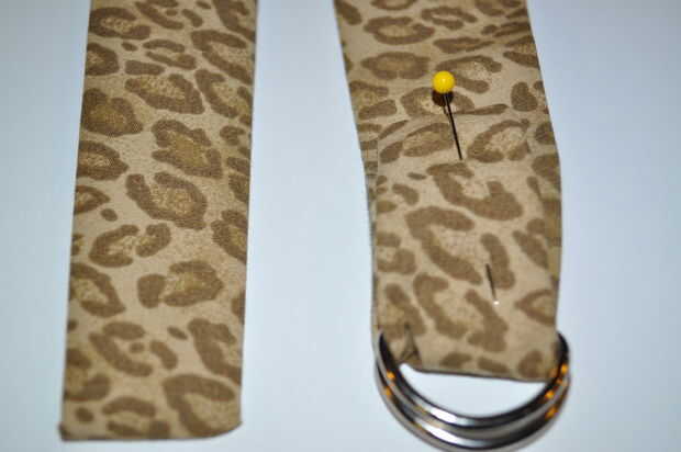 En pretina trasera Coloque dos anillos en D en un extremo y doblar espalda 2" como se muestra y coser el extremo hacia el lado equivocado.