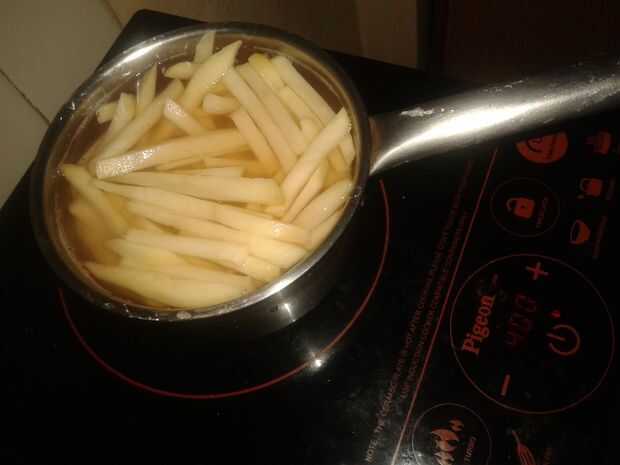 Este proceso es cocinar la capa exterior del almidón de la patata para que cuando el almidón cocido se añaden una capa crujiente exterior.