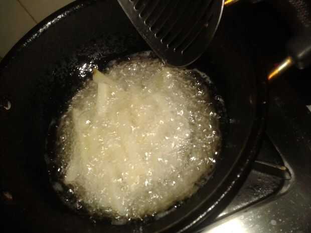 Tomar 20-25 piezas al mismo tiempo y sueltalo lentamente en el aceite a la vez. freírlos durante 2 a 3 minutos o hasta que parecen papas fritas de mc donalds.