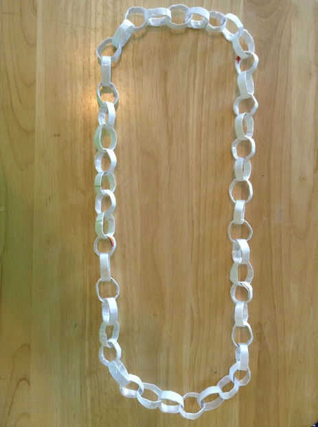 Para iniciar la camisa de cota real, necesita hacer una base. Esto se logra conectando 46 enlaces en forma de cadena circular. Para conectar dos enlaces, empezar haciendo un círculo con uno de los arcos y cintas junto con poco de cinta scotch. a continuación, deslice un extremo del segundo enlace por el medio de la primera y hacer lo mismo. Repita este proceso hasta que haya hecho una cadena de 45 enlaces. A continuación, unir los dos extremos y conectarlos con un último eslabón. El número de enlaces puede variar dependiendo de su tamaño. Soy un tamaño 10/12 y la cadena que hice fue aproximadamente 3'2 ". Ajustar el número de anillos hasta que sienta que es bastante grande.