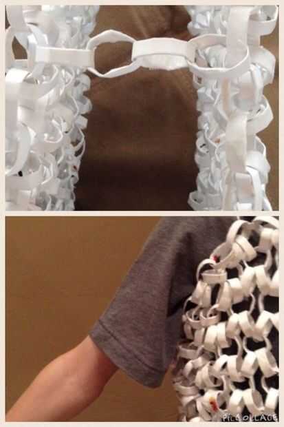 Ahora se forman las correas de hombro. Recoger el final de los correos cadena que comenzó con y examínelo. Para un círculo de 46 enlace, el área que va delante del cuello es de aproximadamente 9 enlaces. Puede que necesite ajustar este número según el tamaño del círculo inicial. En el enlace primero y 9, Inicio una pequeña cadena que es más o menos 4 o 5 enlaces de largo. Conecte el enlace 5 º el enlace que se corresponde con la él al otro lado del círculo. Haciendo esto en el enlace de 1 º y 9 º, habrá formado un agujero para la cabeza y dos agujeros para los brazos. Ahora todo debería verse algo así como una tapa del tanque. La imagen superior es una vista superior de una de las correas del conector. La foto inferior es lo que debería ser el producto.