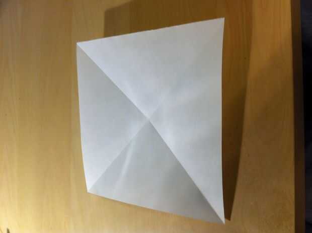 también hacia usted.) El resultado debe ser un cuadrado con dos pliegues que se cruzan a lo largo de las diagonales. Los pliegues deben hacer cuatro triángulos idénticos dentro de la Plaza, con las copas de los encuentro todos en el medio.