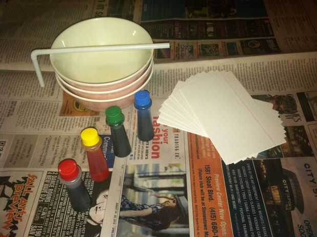 Necesita colorante alimentario, papel/papel cardstock, una pajita, envases vacíos que pueden contener por lo menos media taza de agua, jabón y agua.