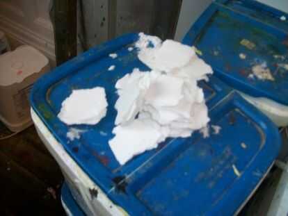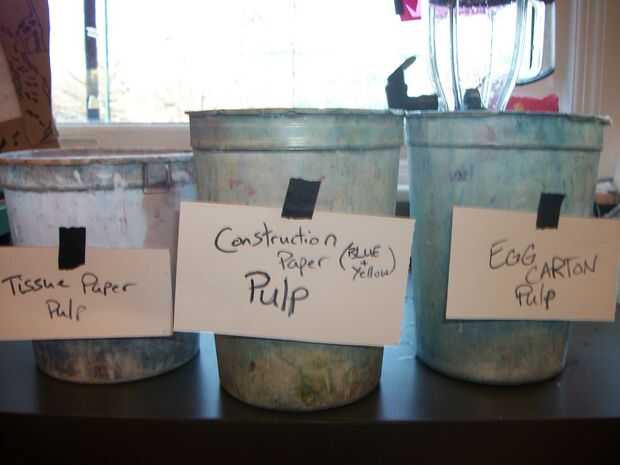 5. ahora tienes pasta de papel. Verter la pulpa en cubos (Asegúrese de que etiquetarlas si se trata de diferentes materiales).
