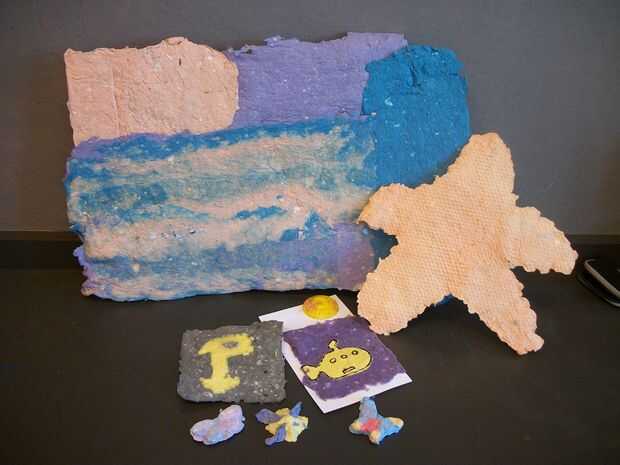 - Mezcla de dos colores de cartulina y ver qué color de pulpa es crear (por ejemplo azul y papel amarillo producen pulpa verde).