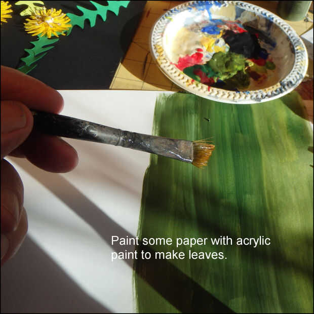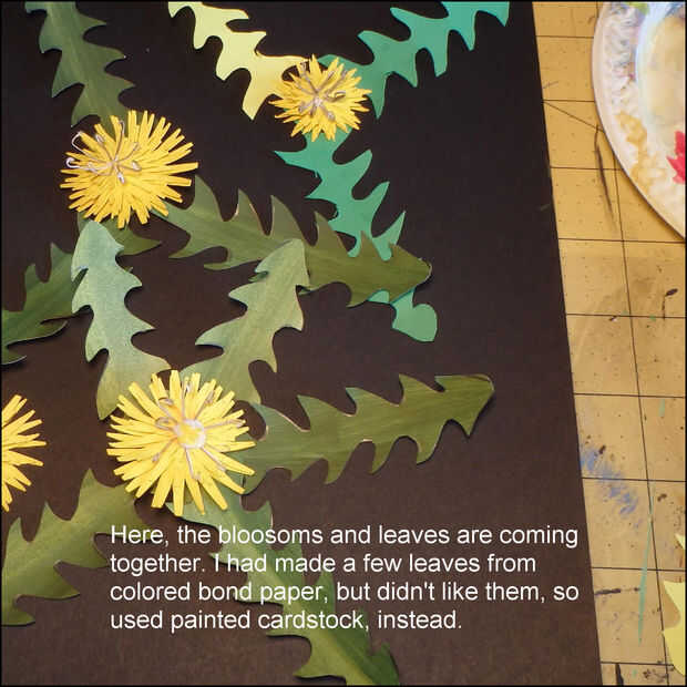 De las hojas, terminó pintando algunos cartulina blanco con pintura acrílica. Había probado algún color papel bond, y estaban ok, pero no lo quería. Pinturas verdes y amarillas fueron utilizadas y mezcladas para el efecto.