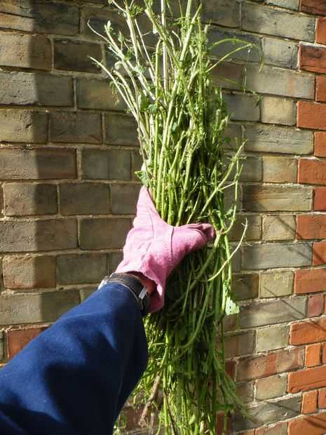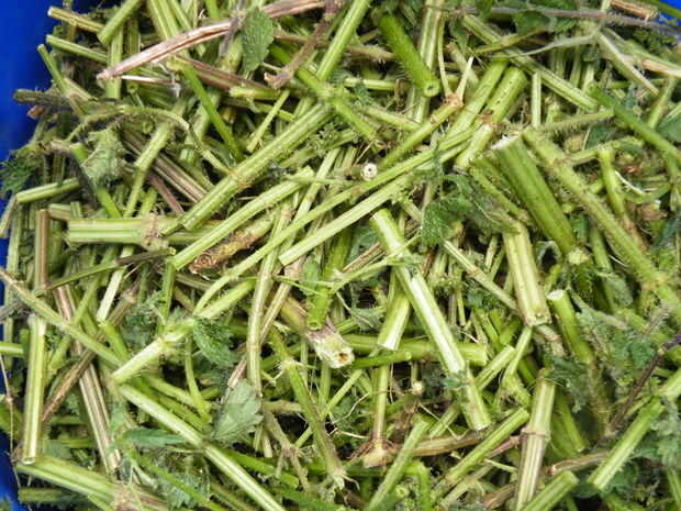 Me la pelaron las hojas y tallos de la hojas de los tallos y el uso de tijeras de podar para reducir a pedazos cortos.