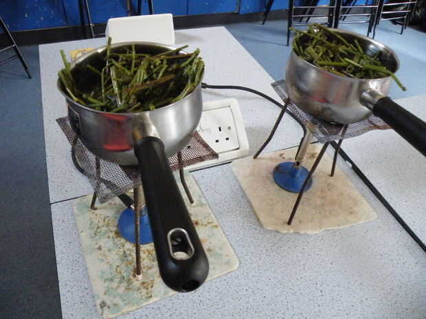 (Después de una semana de enriado en el jardín, la primera tanda de tallos que había recogido olía fuertemente grosellas (vaya figura!). Kitewife puntualmente les negó entrada a la casa, así que tuve que llevarlos al laboratorio para cocinar. Convertir entre cucharadas y molaridad en mi cabeza, agregar aproximadamente 40ml de 2 M NaOH a cada cazo y recargar con sobre un litro de agua. Por favor no diga el Departamento de tecnología de alimentos que pidió prestado sus cacerolas...)