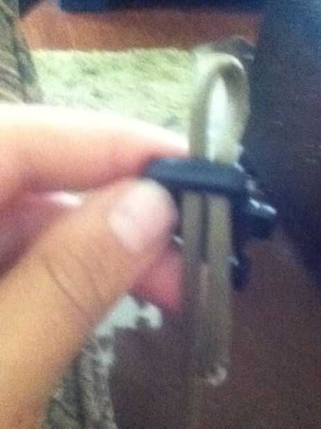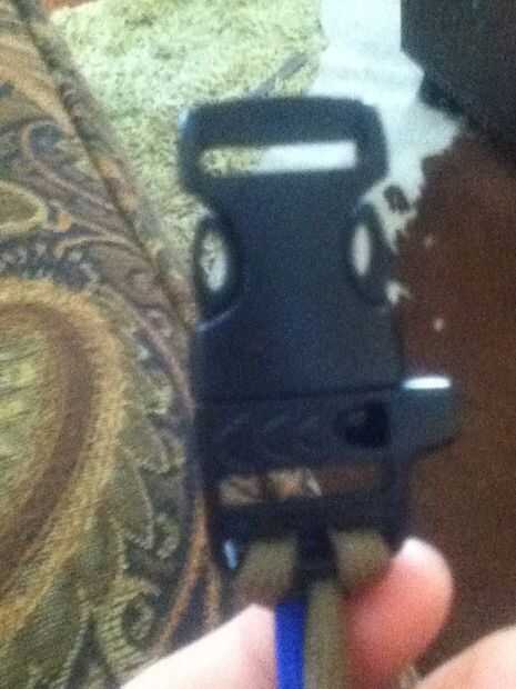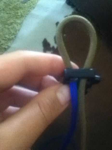 Tomar un extremo de la paracord y poner la hebilla luego tome el extremo y tire hacia abajo en forma de bucle y tire los dos hilos a través del lazo y tire firmemente