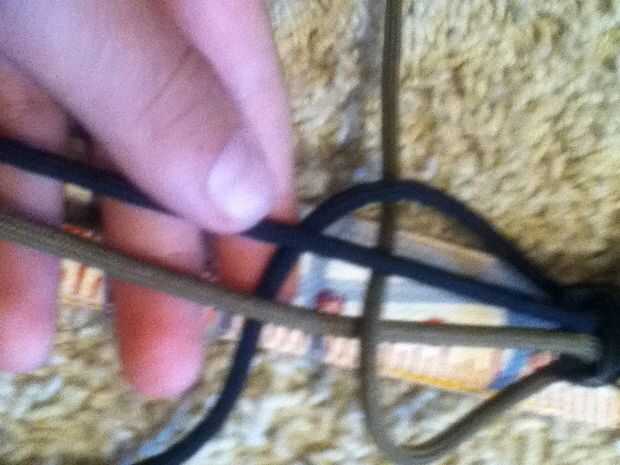 De este tejido que estoy usando una plantilla de paracord pero u no lo necesitas para hacer este tejido. Así que comienzo con el lado derecho sobre y bajo licencia un agujero, luego tomar el lado izquierdo de la u pasar la etiqueta en y debajo de la base y a través del agujero y tire firmemente. Luego u tomar el lado izquierdo (mismo color o con cable que u iniciado el tejido). Más bajo entonces tomar el lado derecho sobre la etiqueta en la base y a través del orificio. Ahora repita los pasos