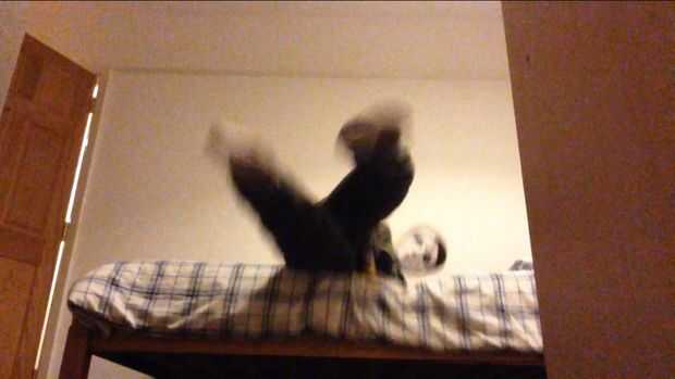 Ok para ello primero tenemos que sentar en su cama. Entonces, ponga su mano en el borde y poner las piernas en la pared, luego patada de la cama y tirar de usted hacia su mano y luego rebotar de la cama en el piso.