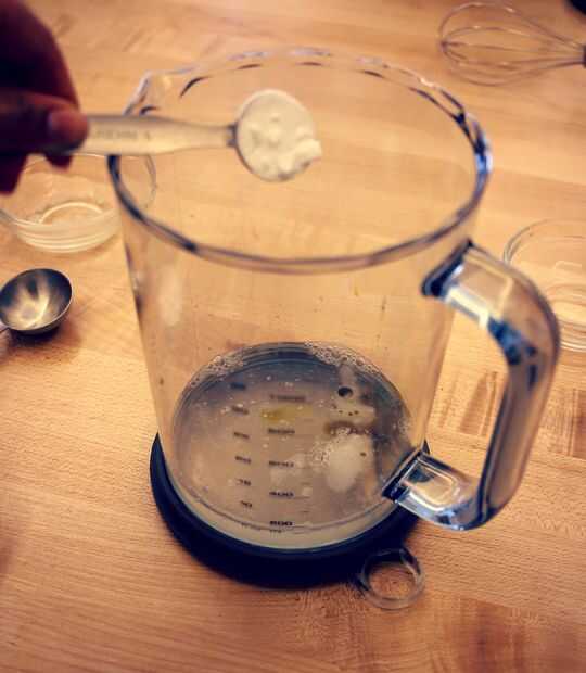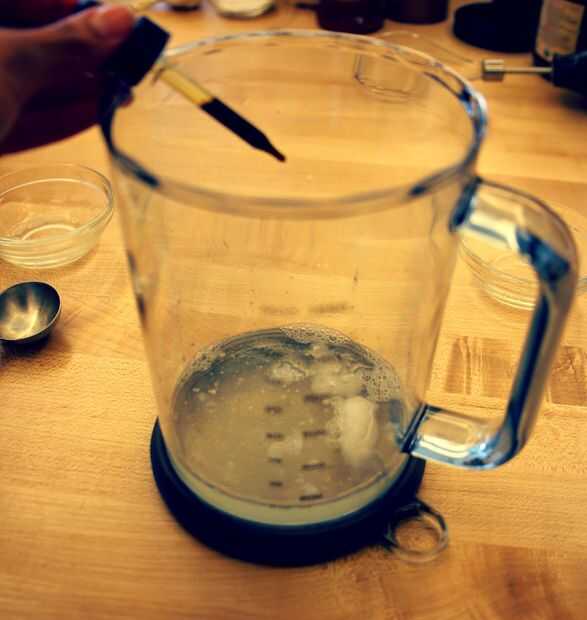 Mezcle el jabón de Castilla, extracción de menta, aceite de coco, agua caliente y bicarbonato de sodio en un recipiente que se puede utilizar para combinar con.