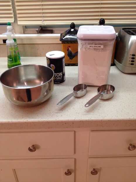• 2 partes de harina• 1 parte de sal de mesa• 1 parte agua (tibio)En un tazón grande mezclar harina, agua y sal. Mezclar bien hasta que se forme una consistencia pastosa. Añadir más harina o agua según sea necesario hasta que la textura se parece a l