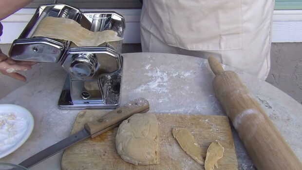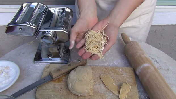 Una vez que los fideos se presionan con un grosor medio, cambiar la biela a los fettuccine o spaghetti (fotografiado). Alinee la hoja de pasta y cortar la masa de fideos.