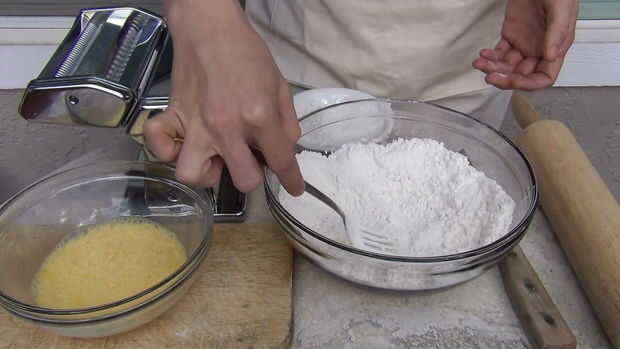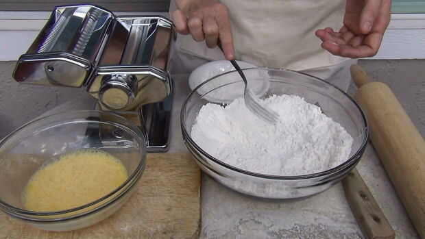 Para formar un pozo en la harina, usar el tenedor para presionar harina alta contra los lados del tazón. Mantener una fina capa de harina en el fondo del recipiente.