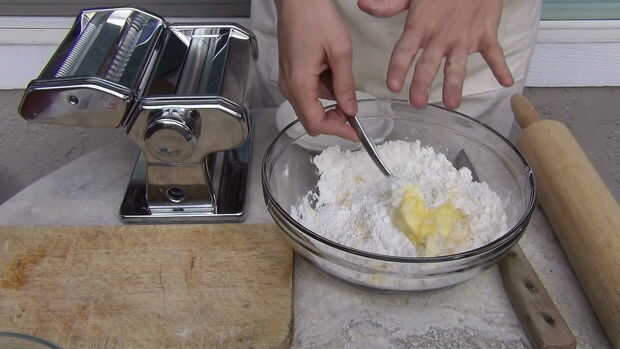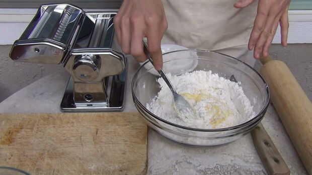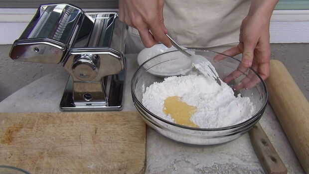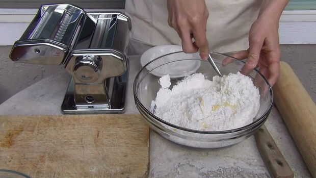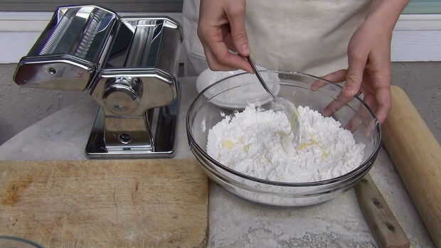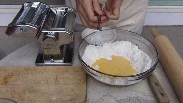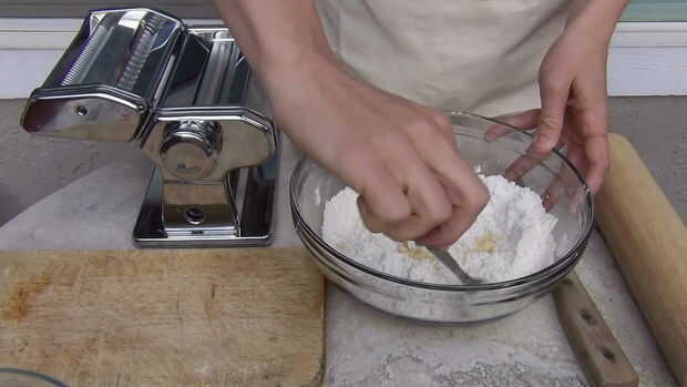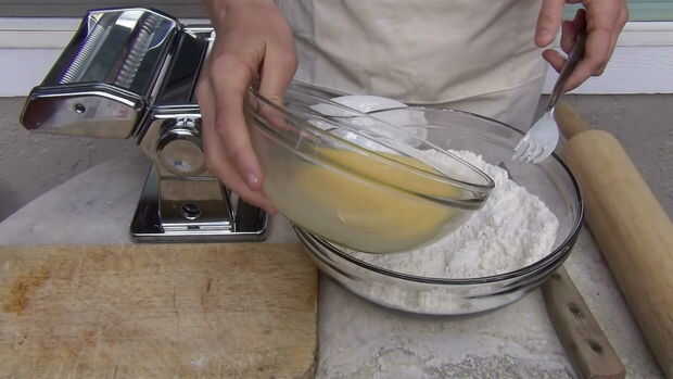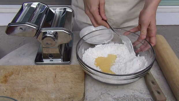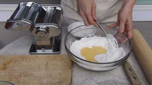 Tenga cuidado de no dejar huevo crudo toque los lados del tazón de fuente. La masa forma un lío pegajoso si huevo no toque la harina todo el tiempo.