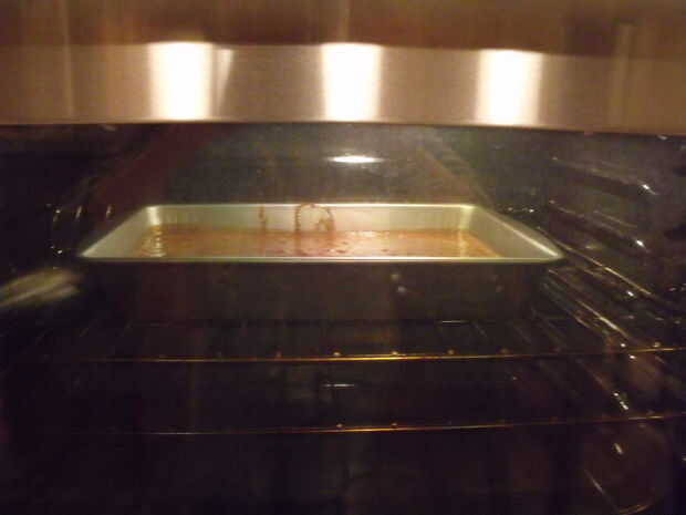 Vierta la masa en una bandeja sin engrasar de 13 X 9!, poner en el horno de 350 grados para 30 minutos.