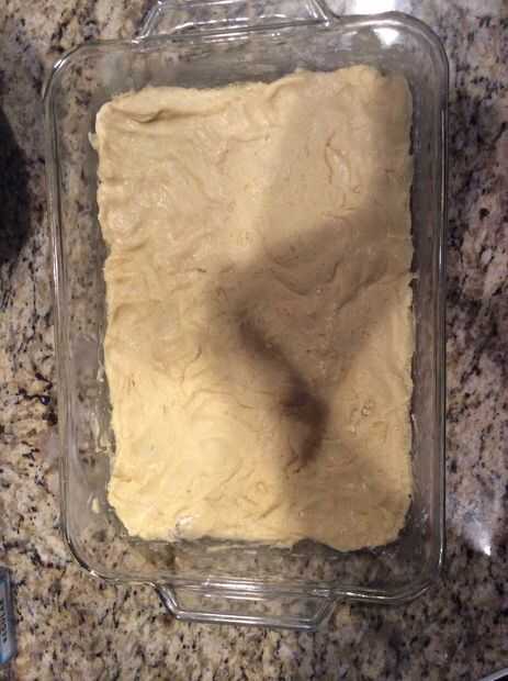 Crack 1egg (bien batido) de la cacerola en un pastel de tamaño regular. Agregue toda caja de mezcla para pastel amarillo. Vierte la mantequilla derretida sobre la mezcla de huevo y amarillo pastel. Ingrediente de la mezcla. Presione la mezcla de ingredientes en la parte inferior de la bandeja de la torta.