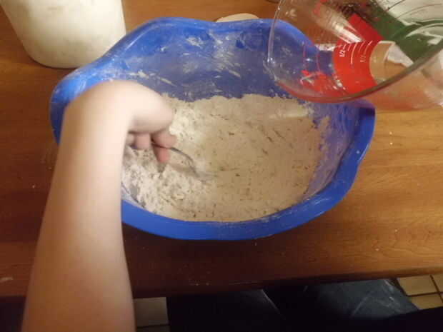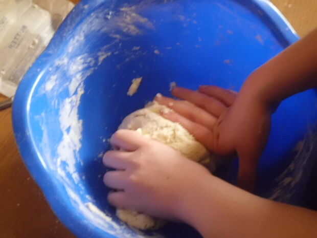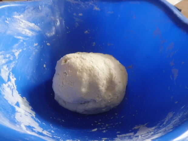 Agregue el agua poco a poco, mezclándola en que ir. Puede que necesite más o menos, que varía de lote a lote. Necesitamos junto con las manos hasta que se forma una bola y luego póngala a un lado. Ahora, es tiempo para trabajar en el relleno!