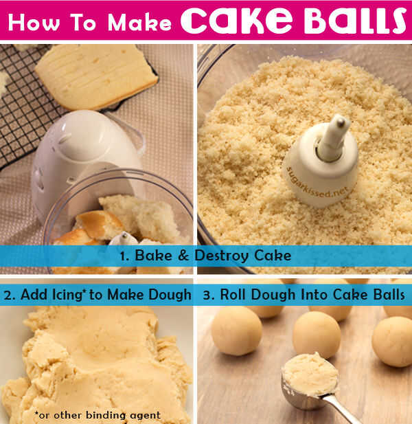 Hornear un pastel y déjalo enfriar completamente. Luego, separe el pastel enfriado y usar un procesador de alimentos para convertirlo en migas. Añadir una pequeña cantidad de hielo a las migajas y rollo de la "masa" crear bolitas de pastel. Para instrucciones paso a paso en la fabricación de bolas de pastel, consulte la cómo a hacer Cake Pops paso a paso instructable.