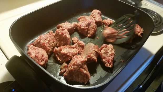 3. Coloque la salchicha en la sartén y romper en trozos pequeños.