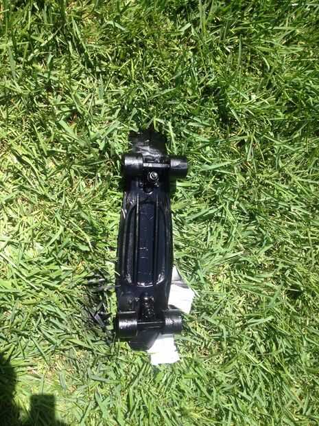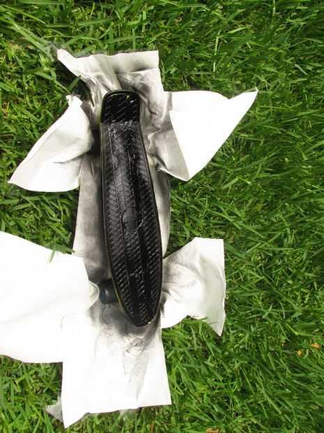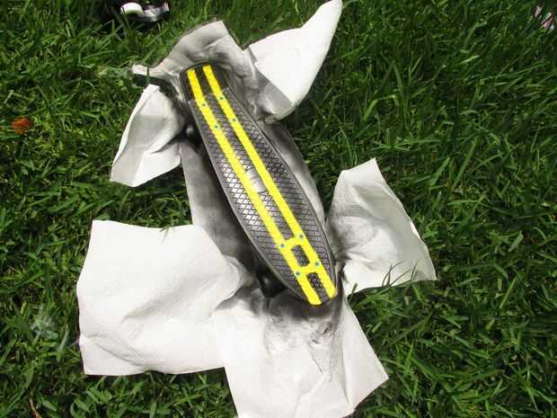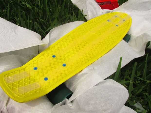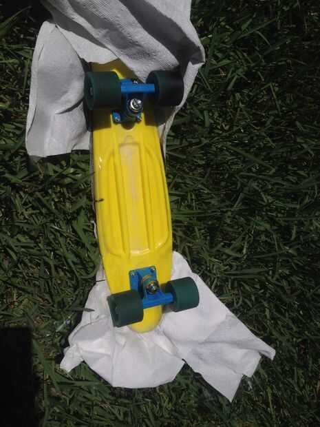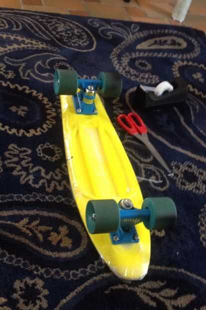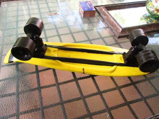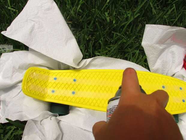Te recomiendo que uses una imagen de referencia de patín de Mituna en línea... Como todos sabéis que tiene su patineta en su colmena así que encontró una foto de la parte superior de su patineta y utiliza como guía. Mi patineta ya estaba amarillo así que sólo necesitaba pintura en aerosol negro. Pero de todos modos grabó la parte superior de la patineta primero. Después la parte inferior con cinta la parte inferior usando artfulimpersonator (son youtubers y si te gusta homestuck totalmente usted debe comprobar fuera) abajo de la patineta como una referencia. Entonces lo tomé fuera y aerosol pintado... Si pintar los troncos y ruedas de ellos puede meterse up...once nuevo solo uso WD-40.