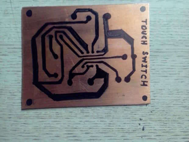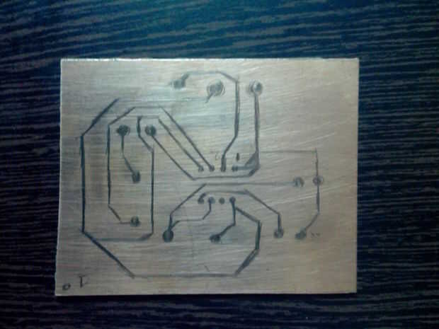 Circuito usando el marcador permanente: Utilizando la referencia de la imagen del circuito impreso en papel brillante primer sorteo bosquejo básico en placa de cobre con lápiz y luego con marcador negro permanente.