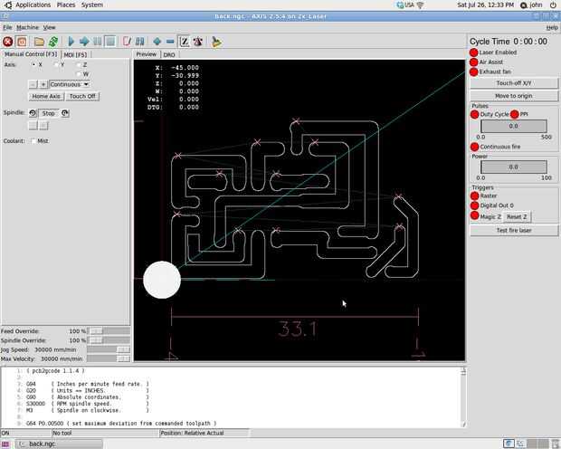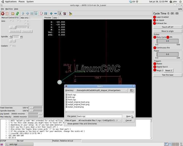 Cuando obtengo el código de G abrir con EMC2 *CAM programa de LinuxCNC (alternativa no-libres de Windows: Mach3). Luego (con la emulación de magia Z molino para láseres: Mach3, EMC2), corro el CNC * y el láser quema sólo lo que un molino comer.