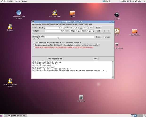 También uso una GUI para pcb2gcode (porque, por alguna razón, es sólo un programa CLI) hechas por un tio muy majo. Usted puede encontrar en su página. Hay muchas otras cosas que admirar allí también!