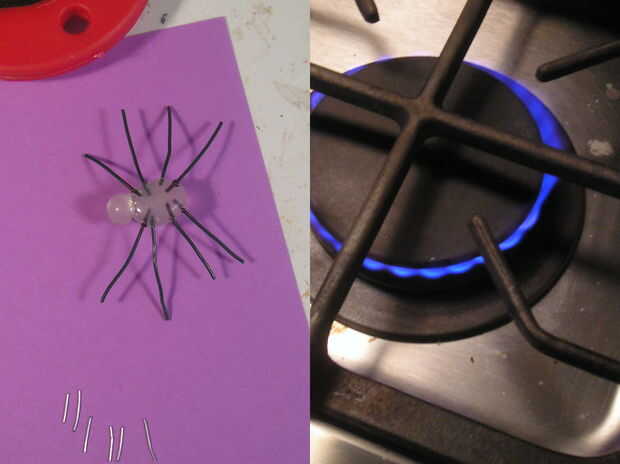 En este paso, usar la estufa para calentar las piernas muy suavemente para que se "derriten" su manera en los cuerpos. Los alicates de punta se utilizan para sostener y para insertar los cables.   Si intenta esto, tenga cuidado para evitar ser quemado. No hace falta decirlo, no deje que los niños intente este paso.  Definitivamente una cosa de adultos.