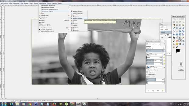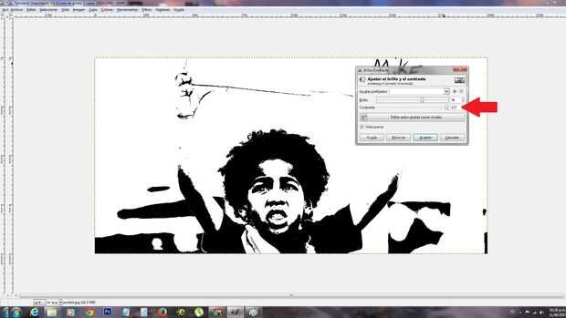 Ahora seleccionamos: Herramientas > Herramientas de color > Brillo y contraste. Nuevamente saldra una ventana con los t.c.. El Brillo lo pondremos a un porcentaje de 36 y el contraste de 127. Vamos a ver como la foto teníamos pasa un contornos en negro. La exportamos y guardamos en formato .jpg