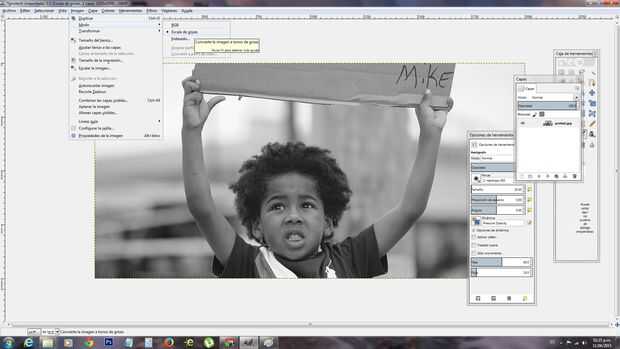 Abrimos la imagen con el editor y nos vamos a la opción: Imagen > Modo > Escala de grises. Saldra una ventana de opciones de herramienta, ajustamos los parámetros oh podemos quedarnos con los predeterminados y nuestra foto pasará un blanco y negro.