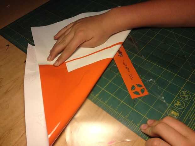 11. finalmente coloca en un pedazo de diverso color de vinilo como soporte y retirar cuidadosamente el papel de transferencia.