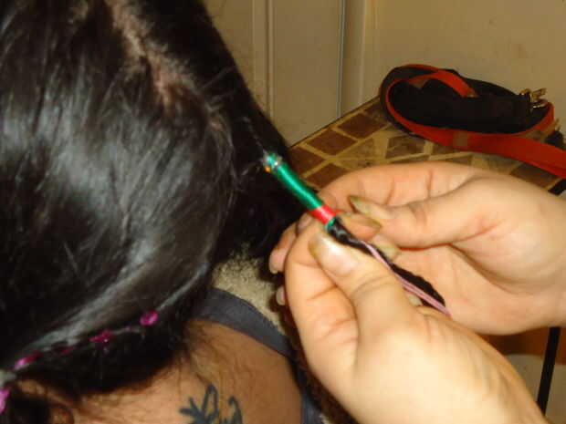 Una vez haya terminado paso cinco comience envolviendo hacia abajo otra vez. Repita los pasos del seis al nueve. Hasta que han envuelto todos menos los últimos dos o tres pulgadas de la trenza.