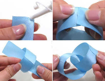 Cortar dos cintas de raso de 14cm; exprimir un poco de pegamento en un lado de una cinta. Lo del círculo y pegar ambos extremos. Poner la otra cinta en el círculo; pegar ambos extremos.