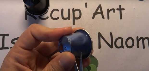 Tomar las cápsulas de café de elección. Limpieza y corte en adelante la parte inferior y superior. La pieza lateral debe ser totalmente aplanado. Toma tus Tijeras decorativas de elección y cortar el lado de la pieza aplanada para crear un borde. Doblar este borde. Ahora tienes una mezcla de plata y su color de pod de café.