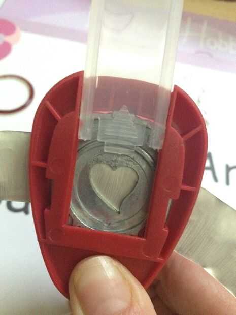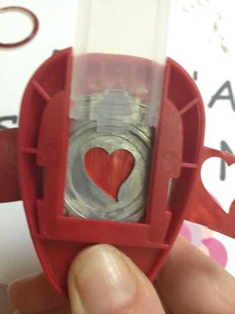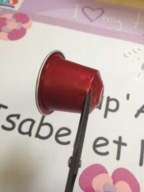 Tomar una cápsula de café limpio y corte la parte superior e inferior. La parte media que se puede utilizar para cortar su corazón. Utilice el corazón más pequeño en forma de golpe, como se muestra en las fotos.