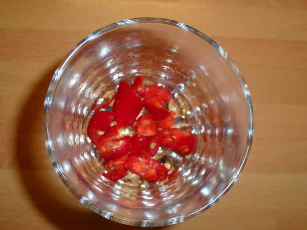 En primer lugar, cortar los chiles tan finamente como sea posible. Ponerlos en una de las gafas. Trate de compacto hacia abajo un poco.