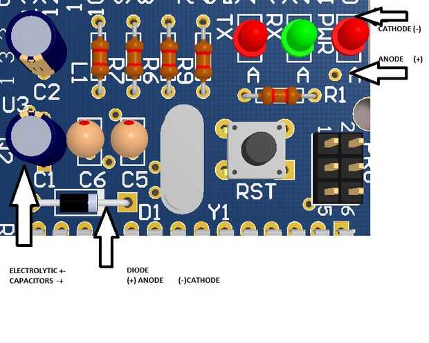 Algunos componentes tienen polaridad como condensadores y diodos, la figura de arriba muestra cómo montar correctamente.