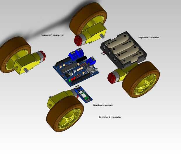 Control mediante comunicación serial o Bluetooth, los motores del lado derecho estaban conectados a MT1, los motores del lado izquierdo a los conectores de MT2.