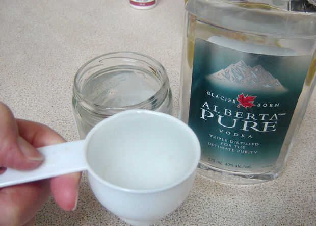 Mide 1/4 de taza de vodka/Everclear y vierta en la jarra.
