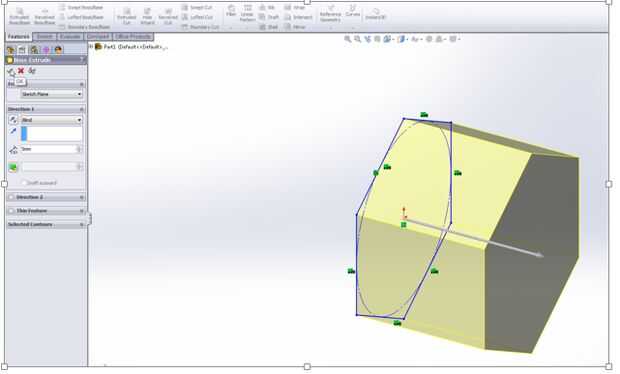 1. para sacar el polígono, ir a la función en la barra de herramientas de función de comando. 2. Seleccione extrusión Base jefe. 3. a la izquierda es el menú de extrusión jefe, ajuste una profundidad de 5 mm. 4. ok. (Figura 1)