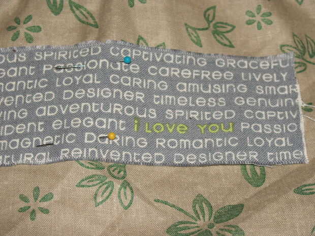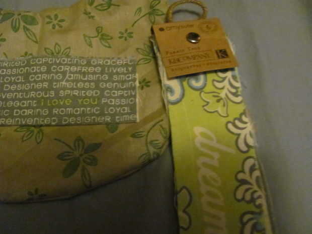 Puede hacer adornos para poner en, nuestro Compro algo premade.  Aquí utilicé etiquetas de tela, que son más o menos muestras por Amy Butler para K y compañía.  También podría utilizar un pedazo de cinta o cortar un forma o carta de la tela.