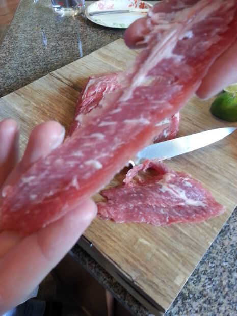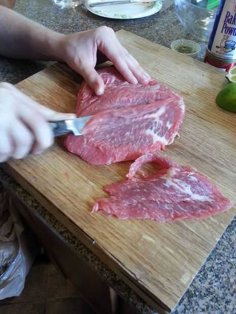 Corte el flanco filete contra el grano de la carne para reducir la dureza y puesto que se trata de una cocina asiática después de todo en que tenemos que cortar la carne rodajas fácil de masticar. Corto mina delgada por lo que no tiene mucha dureza y se cocinará todo el camino a través. Yo diría que se puede cortar tan delgadamente como tu quieras pero para estar seguro, mantenga en o debajo de la mitad de una longitud de uñas.