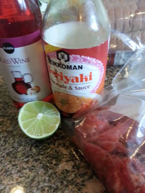 Cuando el corte hecho tirar la carne en una bolsa de plástico con la salsa de soja, salsa teriyaki, rodaja de limón y vino de cocina.