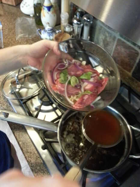 Por último, verter el caldo hirviendo base sobre su tazón de fuente y ver como se acaba de hacer Phở!
