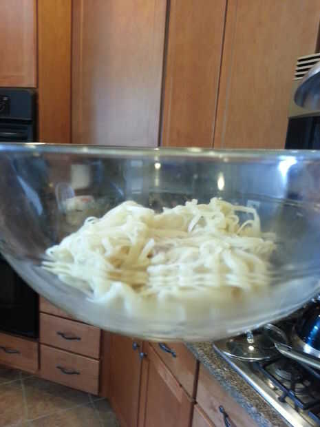 En primer lugar, poner los fideos semi cojear en el recipiente que servirá.