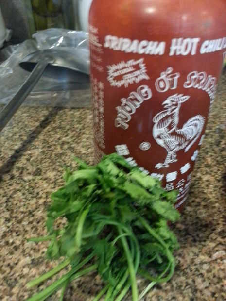 Para guarniciones, usé cilantro y un montón de salsa Sriracha como se puede ver.