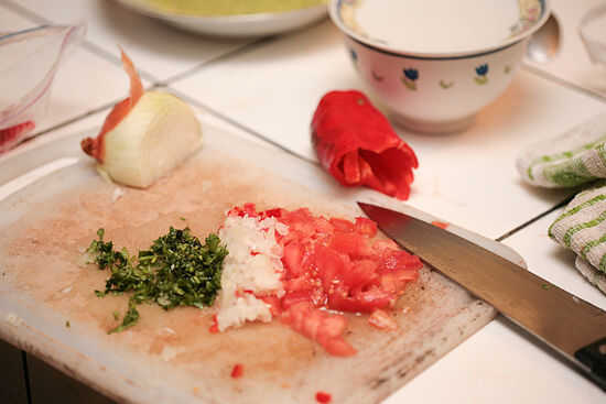 Cortar los tomates, cebollas, cilanto y ajo en trozos pequeños.