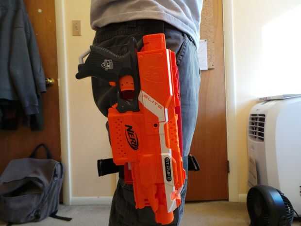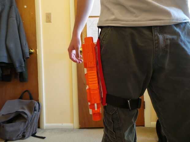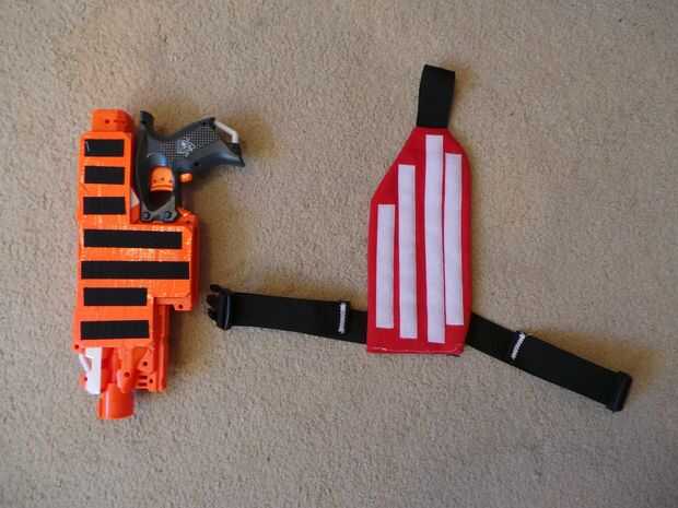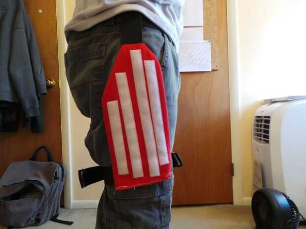 Si no está familiarizado con el diseño original, la premisa es la misma: quería una manera de llevar mi blaster a través de juegos sin tratar con correas o pistoleras abultadas. El mapa fue la solución perfecta para esto. Toma casi sin espacio a menos que la pistola está en él y no entorpecen mi movimiento en todos. Los imanes mantienen la pistola en la pierna mientras el Velcro evita que la pistola caiga. El Velcro proporciona realmente casi no hay fuerza de retención en el blaster.